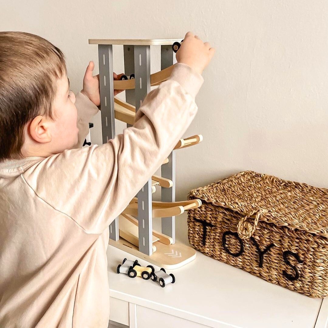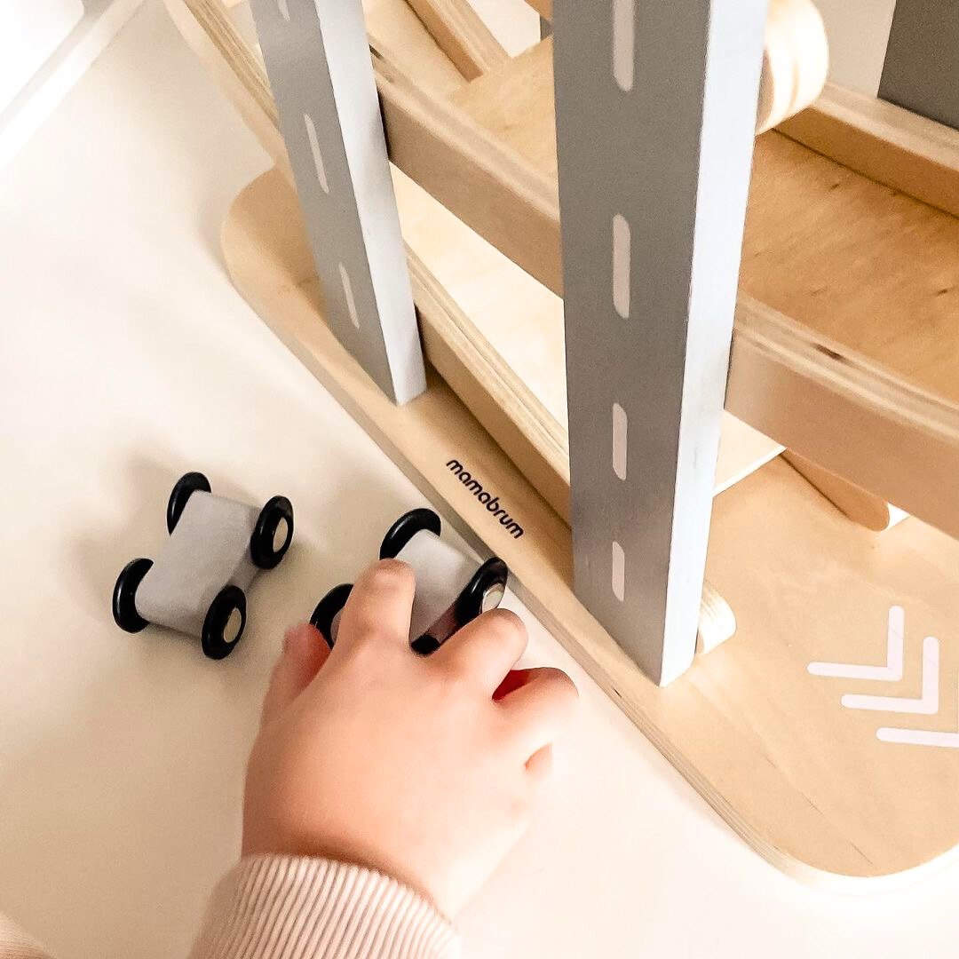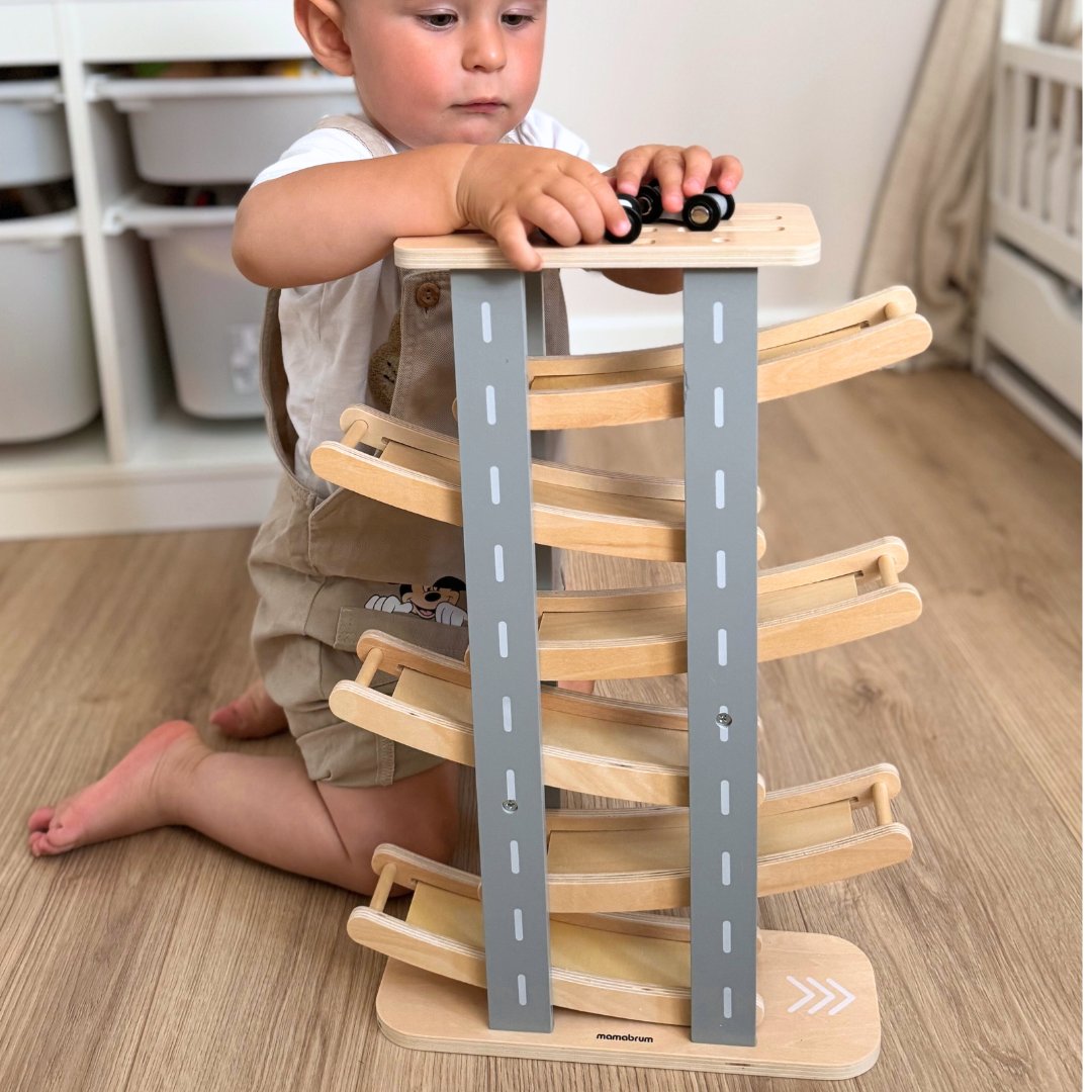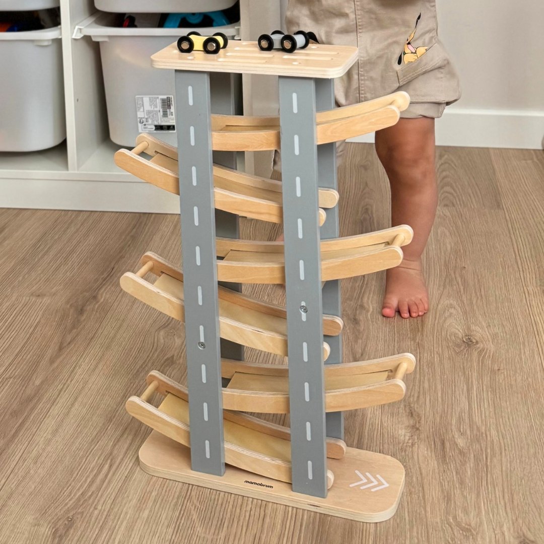 Träbanan med bilar kommer att bli den perfekta presenten till en liten bilälskare. Ta helt enkelt bort bilen från parkeringen högst upp och placera den på banans översta våning. Bilen kommer sedan att köra nedåt, klättra upp för alla våningar en efter en och få fart att köra. Denna vy kommer garanterat att glädja alla småbarn. Träbanan erbjuder inte bara underhållning, utan stöder också småbarnens utveckling.