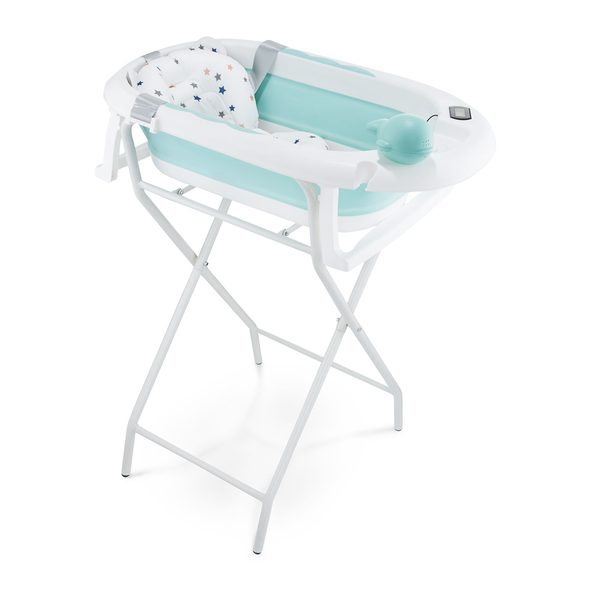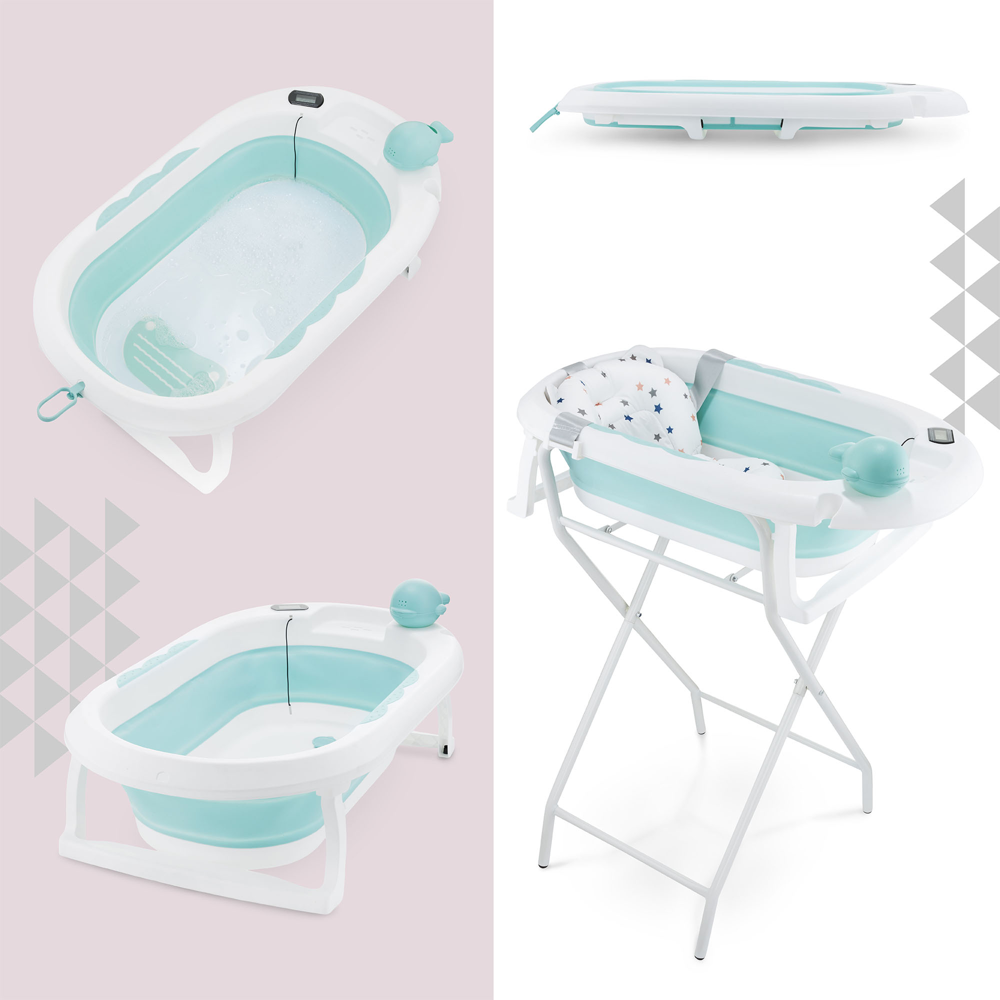 Hopfällbart babybadkar med termometer, insats och stativ - mintfärgad
