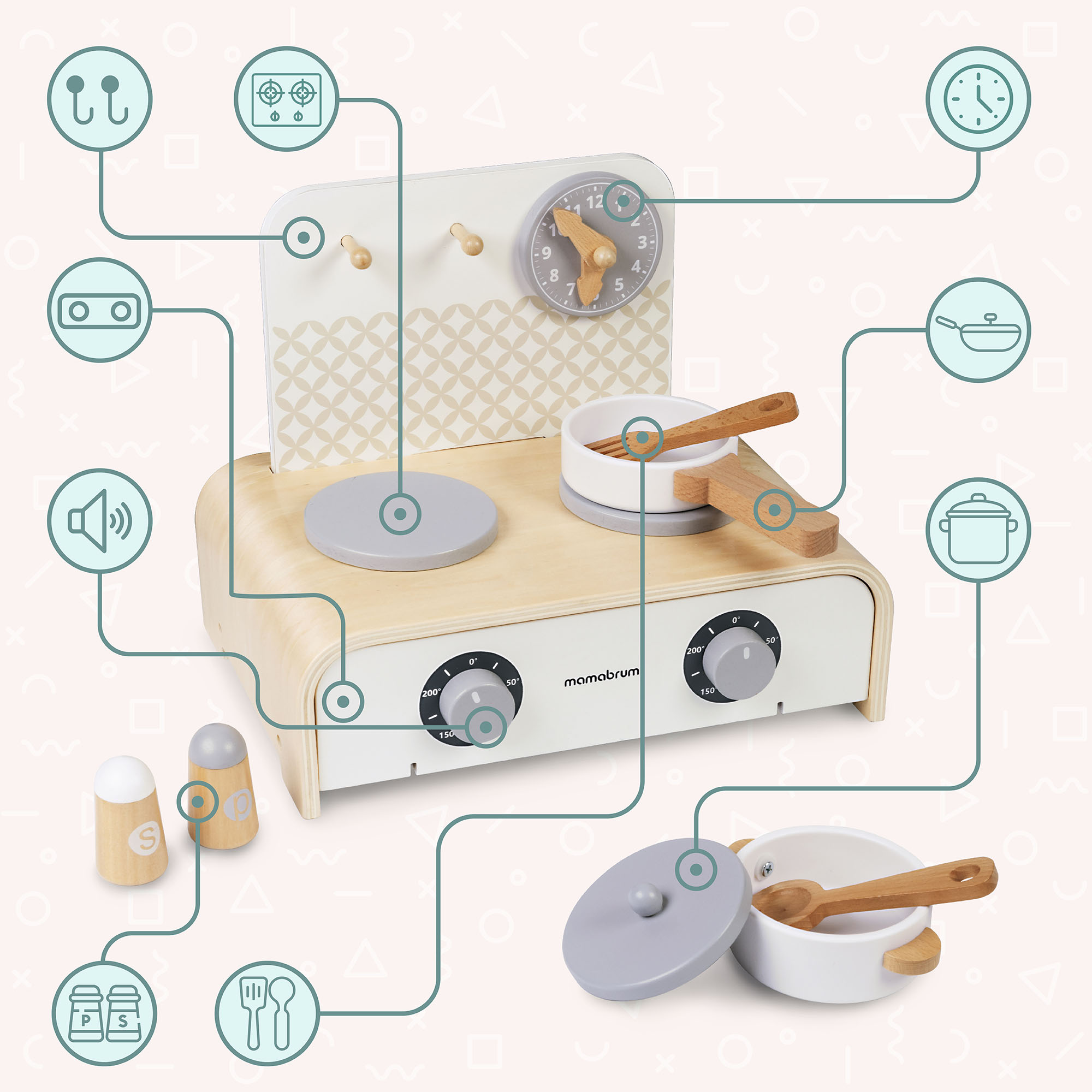 Detta minikök har allt en liten kock behöver för att påbörja sitt kulinariska äventyr. Setet innehåller kastruller, stekpanna, salt- och pepparkar och träbestick , vilket gör att de kan återskapa vardagliga kökssituationer. Genom att vrida på klickrattarna, mäta tiden på klockan och "laga mat" på de två brännarna kan barn imitera vuxna och skapa sina egna recept, vilket ger realism och spänning till lekupplevelsen.
