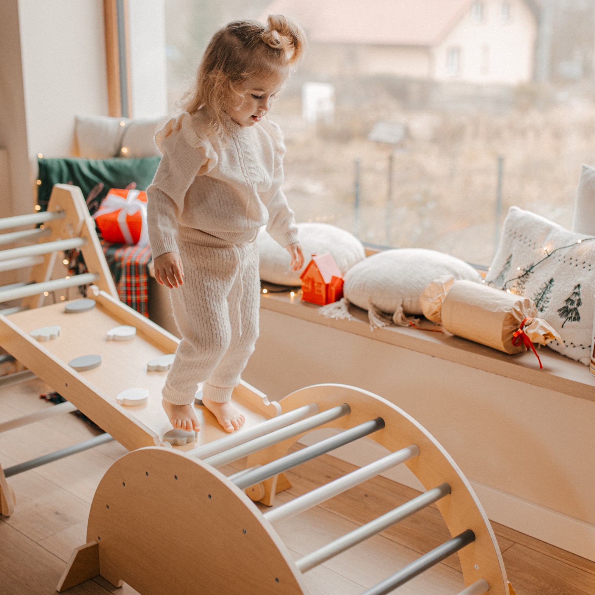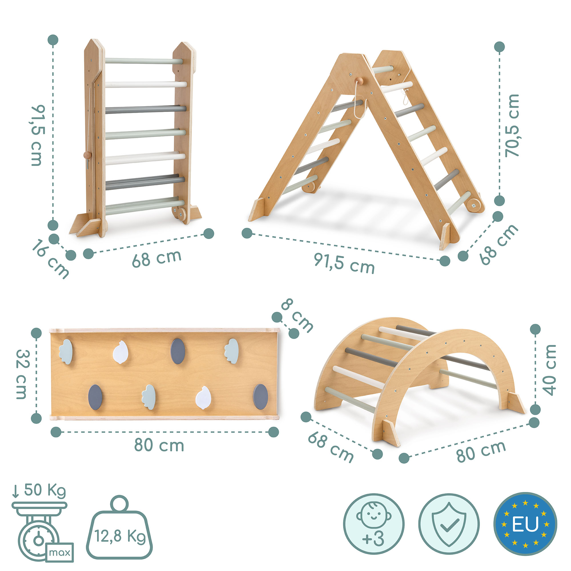 Denna trälekplats är den perfekta lösningen för föräldrar som vill ge sina barn en daglig dos av motion och skoj utan att lämna hemmet. Lekplatsen består av en Pikler-triangel, en klätterbåge/gunga och en dubbelsidig ramp, som kan kombineras i olika konfigurationer . Detta uppmuntrar till klättring, balansering, glidning och byggande av hinderbanor. Detta set stödjer utvecklingen av grovmotorik, koordination och självförtroende hos barn.