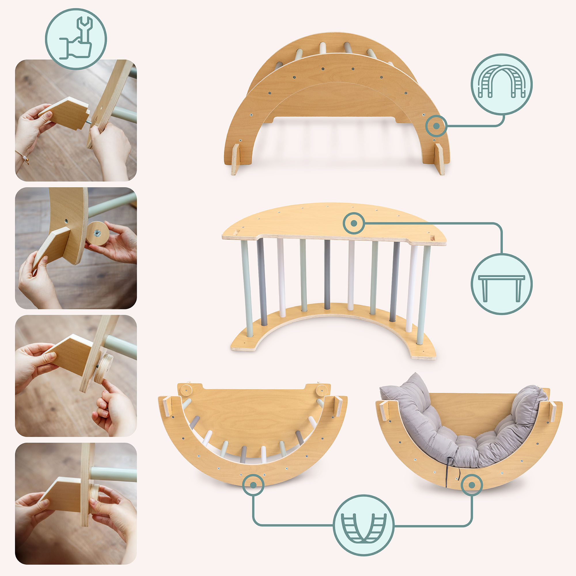 - Klätterbåge - för klättring och balansering, när den vänds på sidan kan strukturen fungera som ett praktiskt bord för att rita, läsa eller leka.