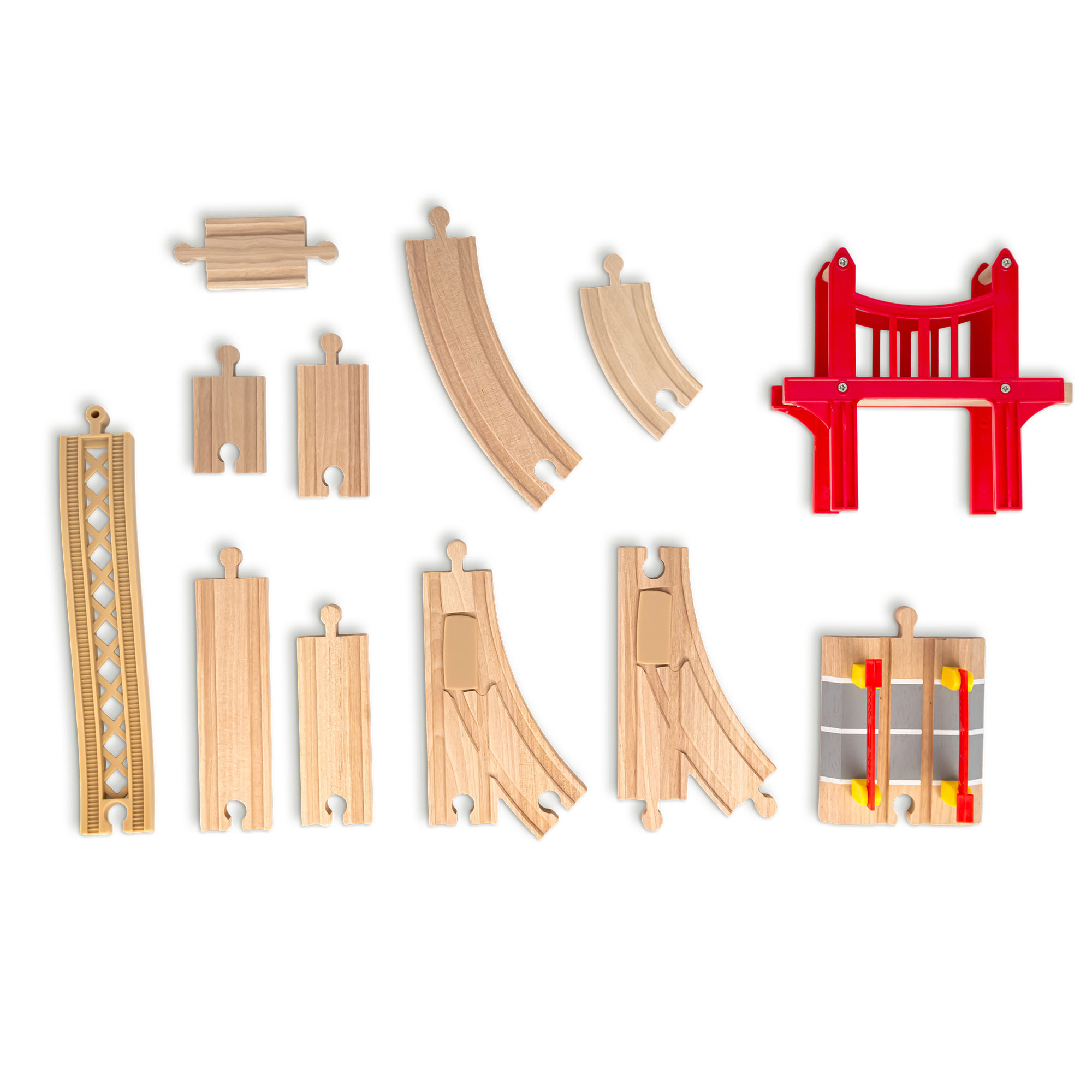 Broar med ramper och järnvägstunnlar ger dynamik och karaktär till hela setet. Barn kan se tåget köra in på bron, korsa viadukten och sedan försvinna in i tunneln. Detta spännande lekelement gör varje åktur unik . Dessutom hjälper broar och tunnlar till att utveckla den rumsliga fantasin och lära ut ruttplanering.