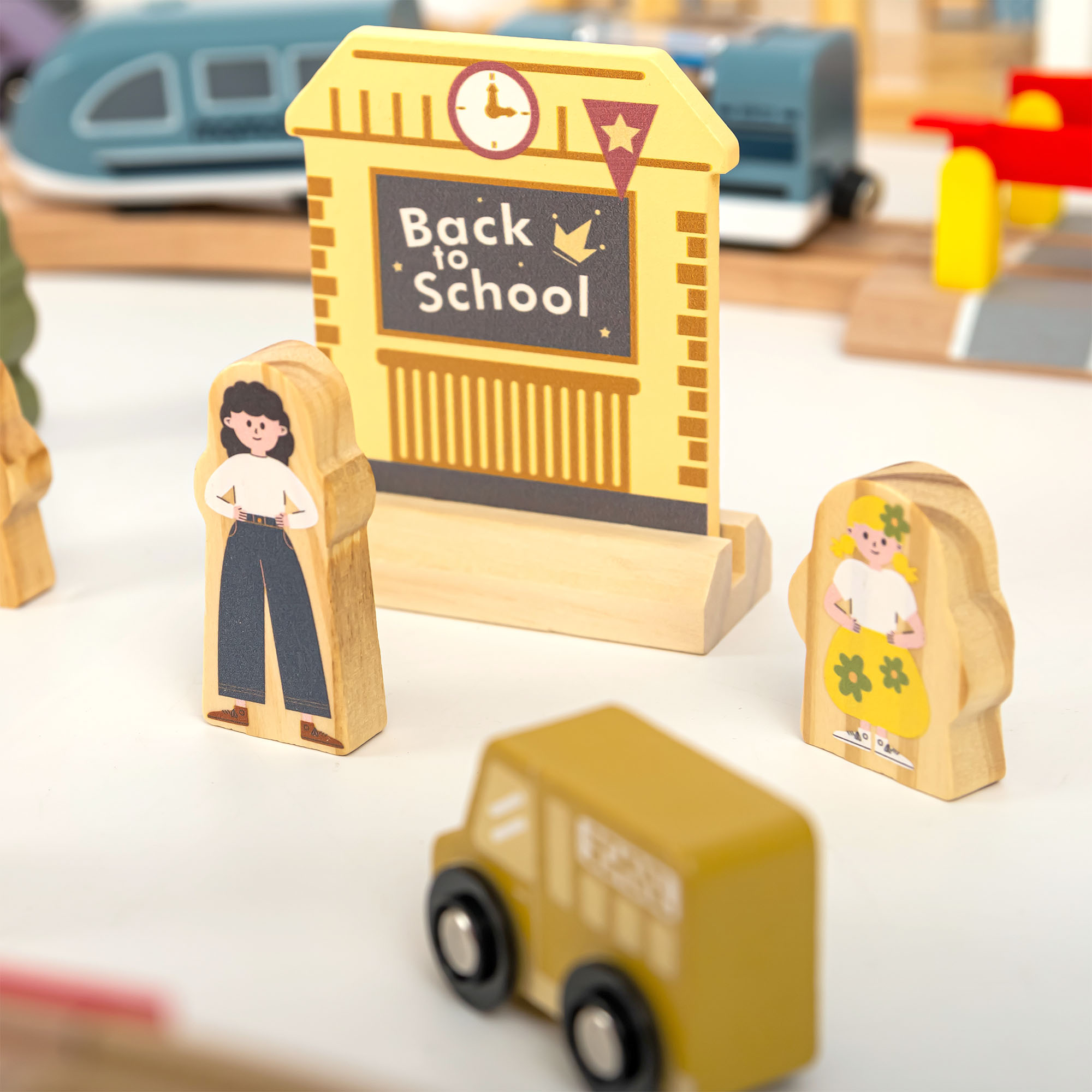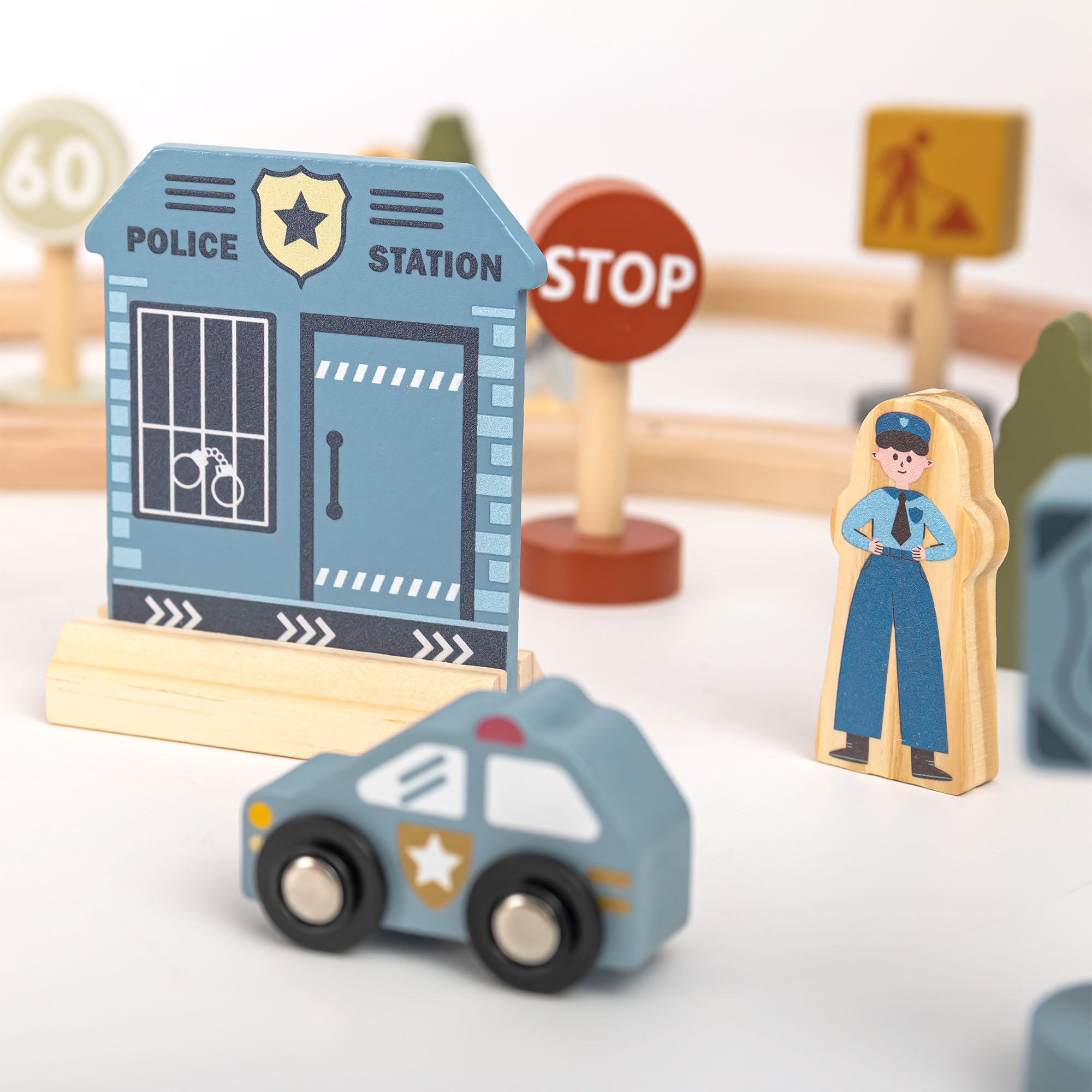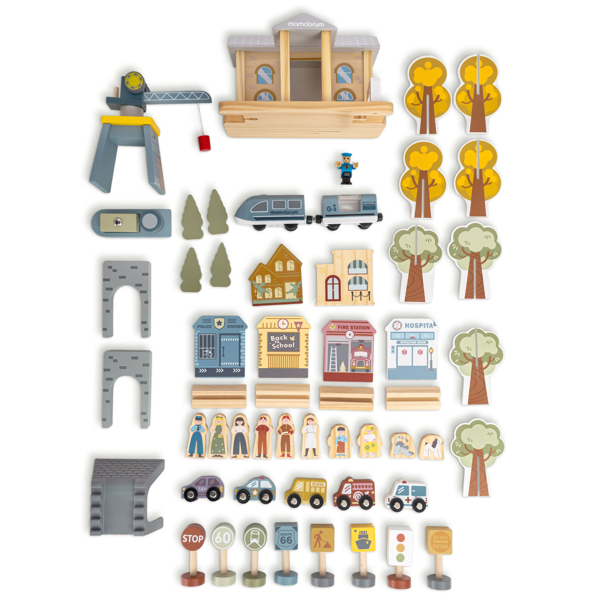 Setet innehåller allt som behövs för att skapa en livlig stad: skola, sjukhus, brandstation, polisstation , vägskyltar, träd och invånare. Barn kan rollspela vardagliga scener – räddning, undervisning, patrullering och trafikdirigering. Att leka staden utvecklar empati, förståelse för sociala roller och stimulerar kreativitet. Varje barn kan vara lokförare idag och brandman eller läkare imorgon.