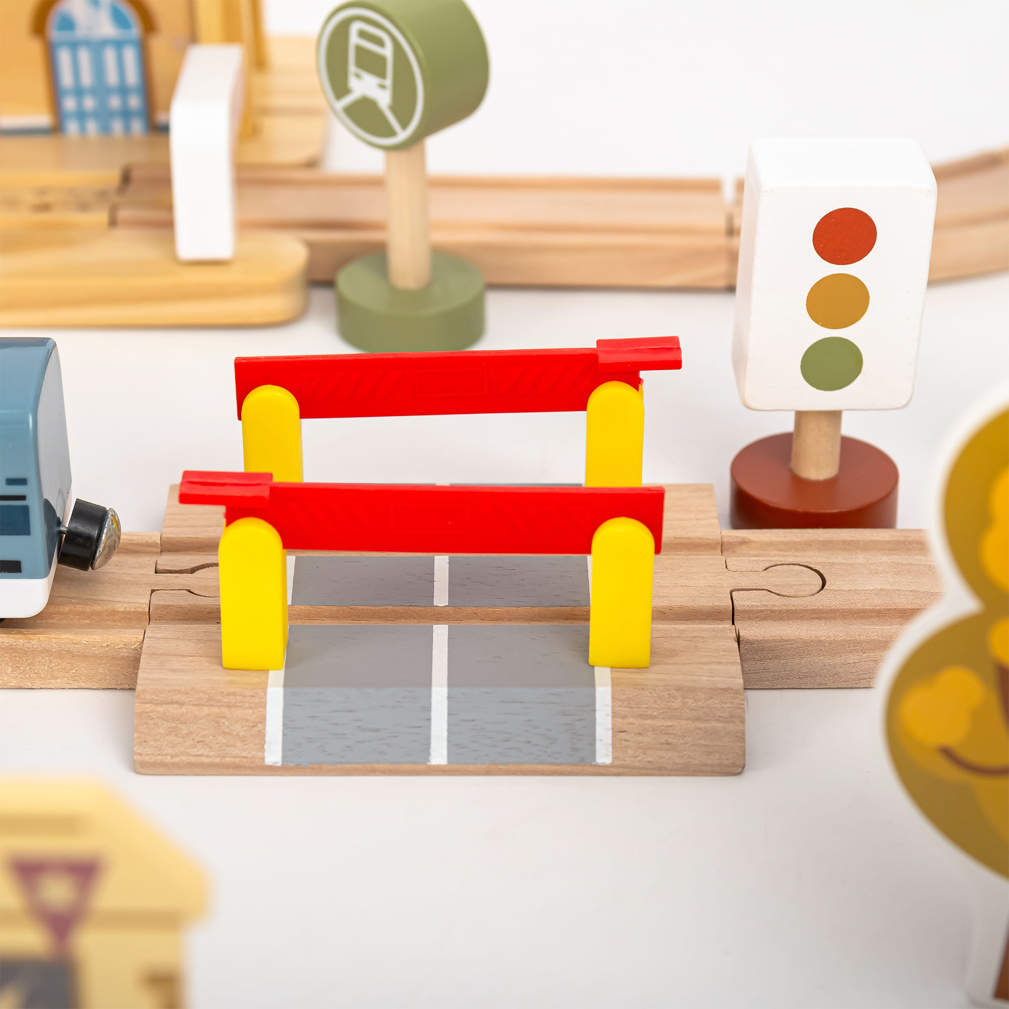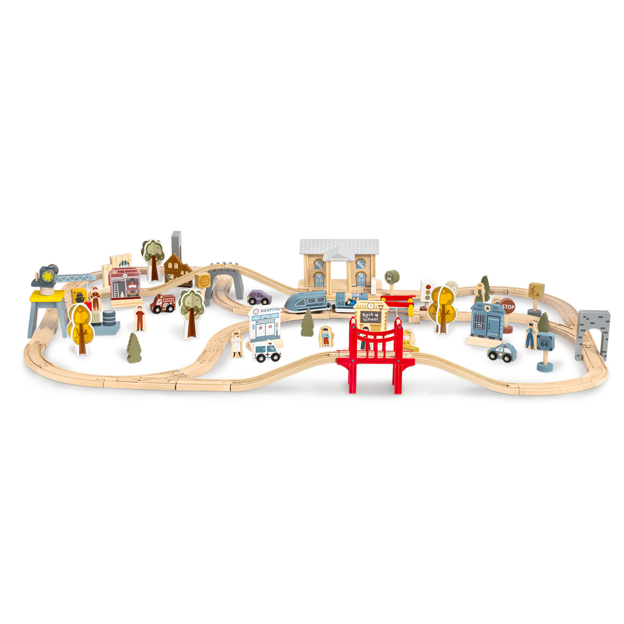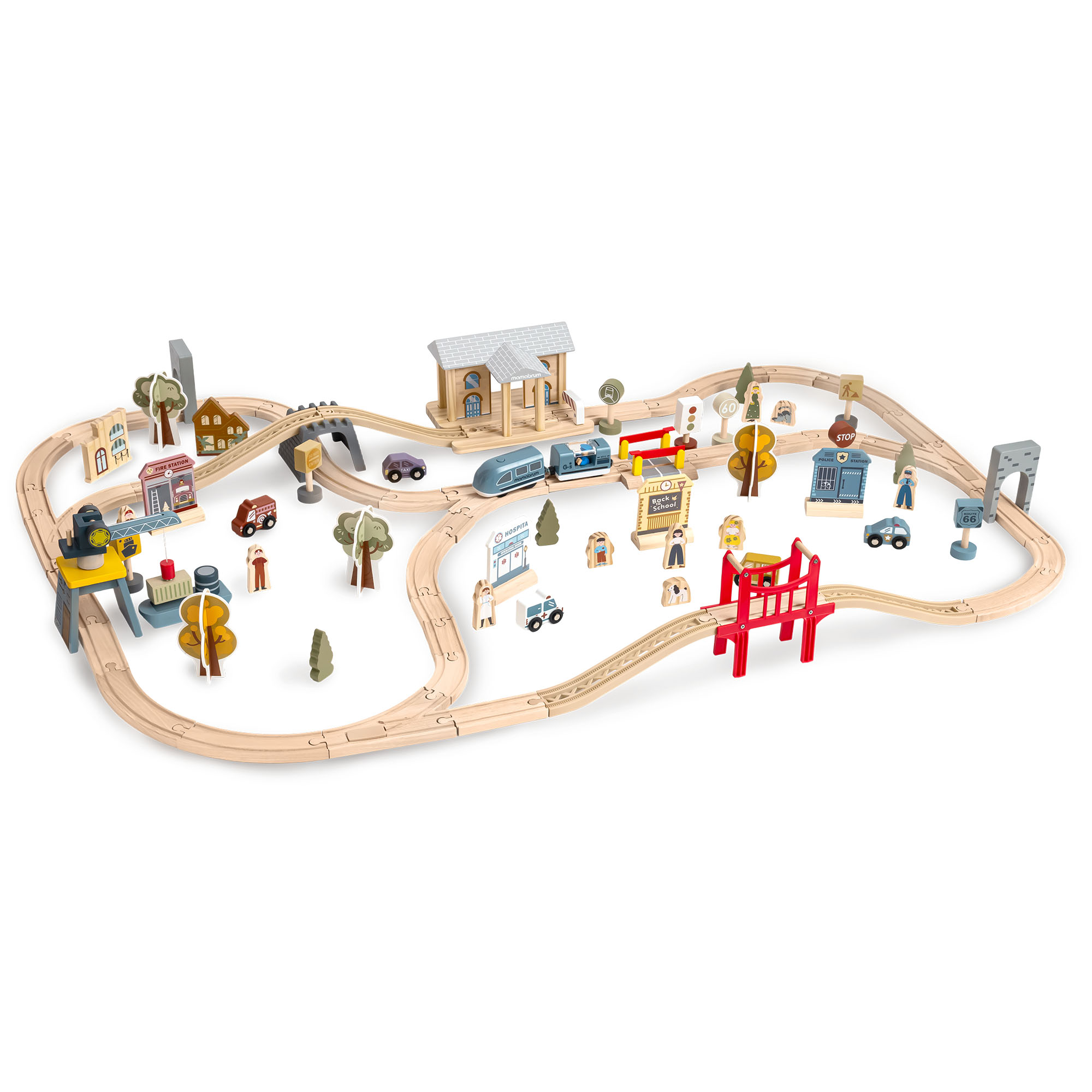 Transportera ditt barn till en livlig stad full av äventyr! Detta trätågset är ett omfattande set som imponerar med sitt antal delar, högkvalitativa utförande och sin uppfinningsrikedom.