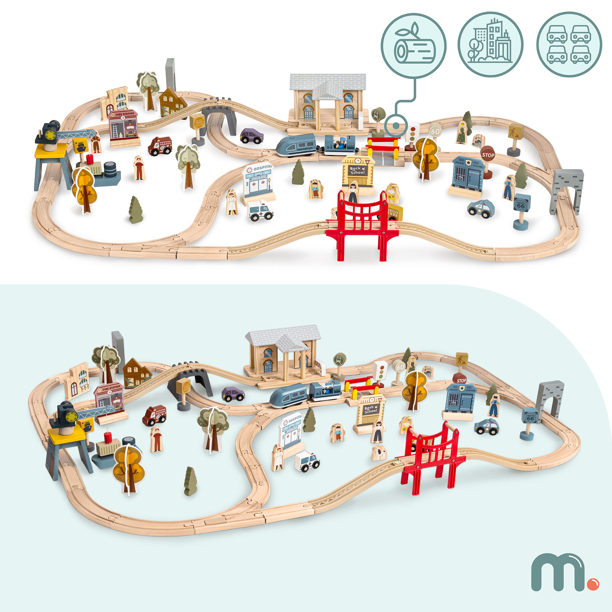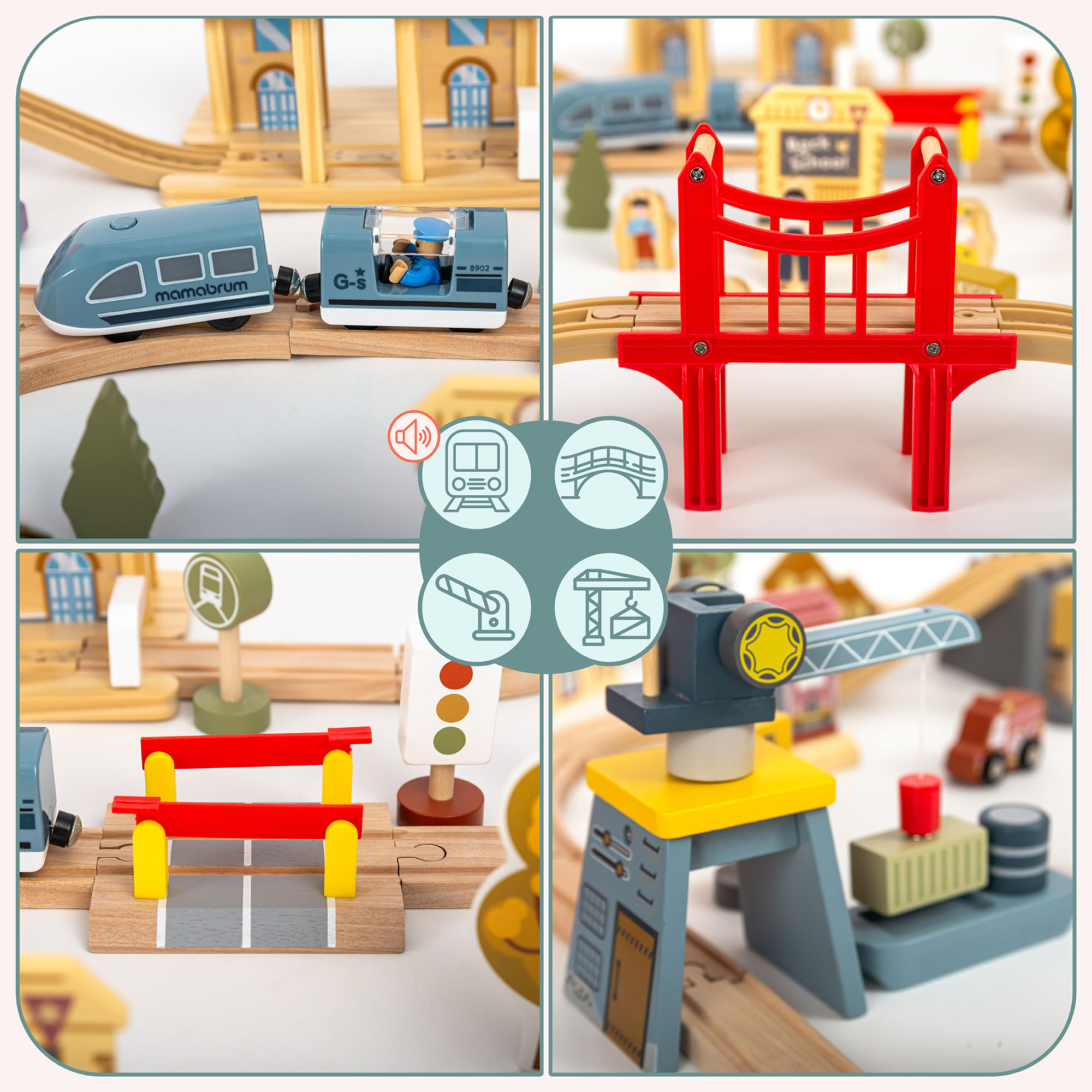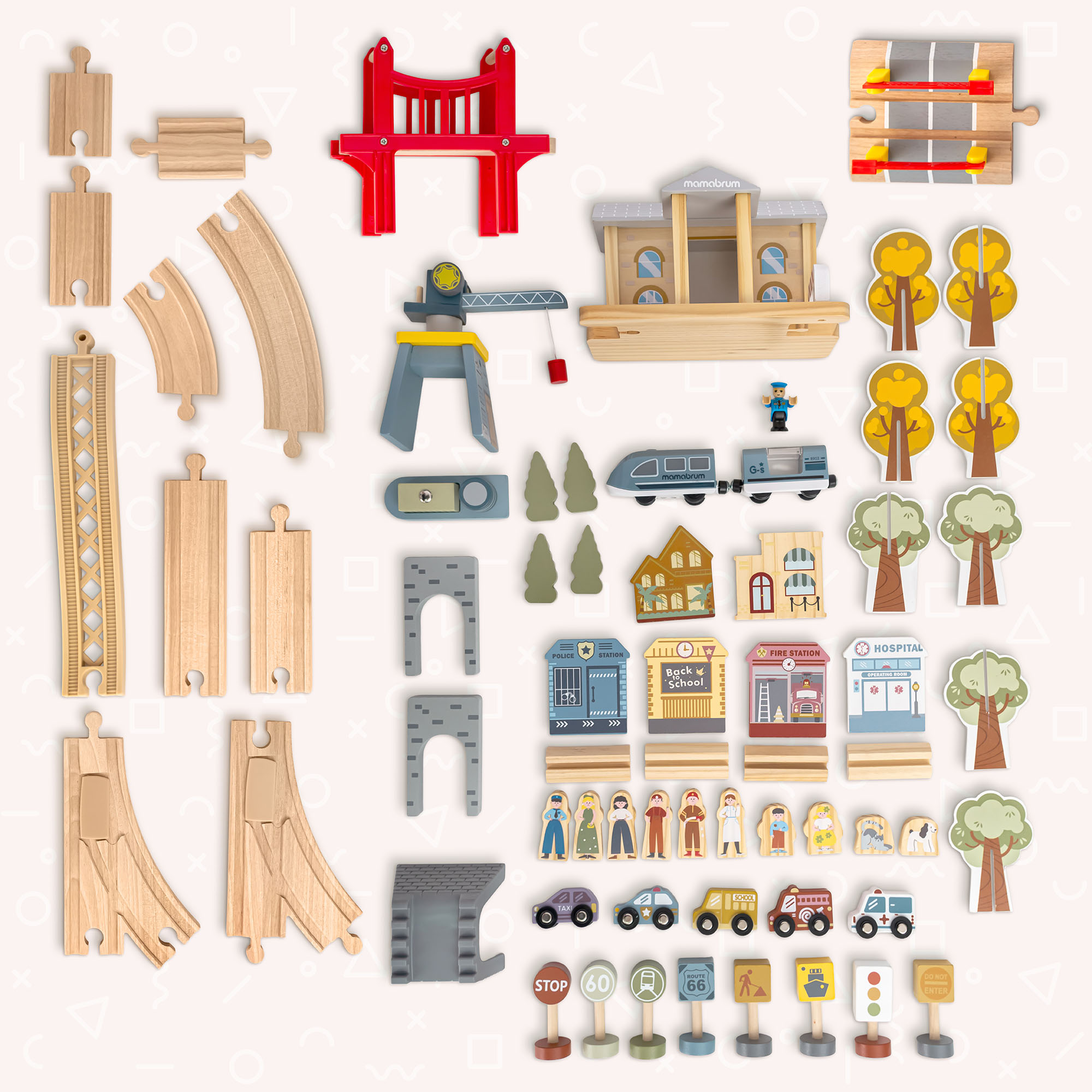 Transportera ditt barn till en livlig stad full av äventyr! Detta trätågset är ett omfattande set som imponerar med sitt antal delar, högkvalitativa utförande och sin uppfinningsrikedom.
