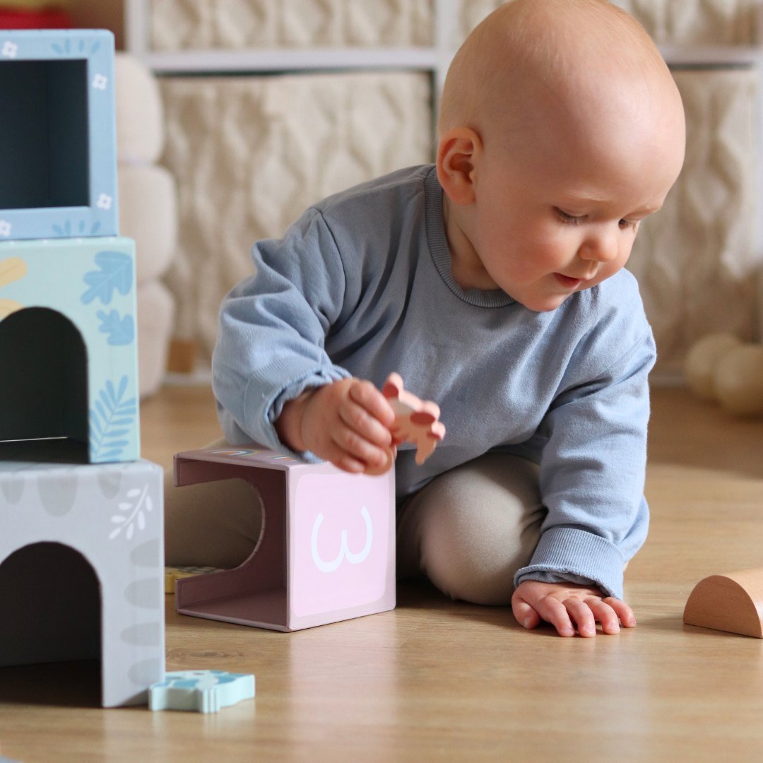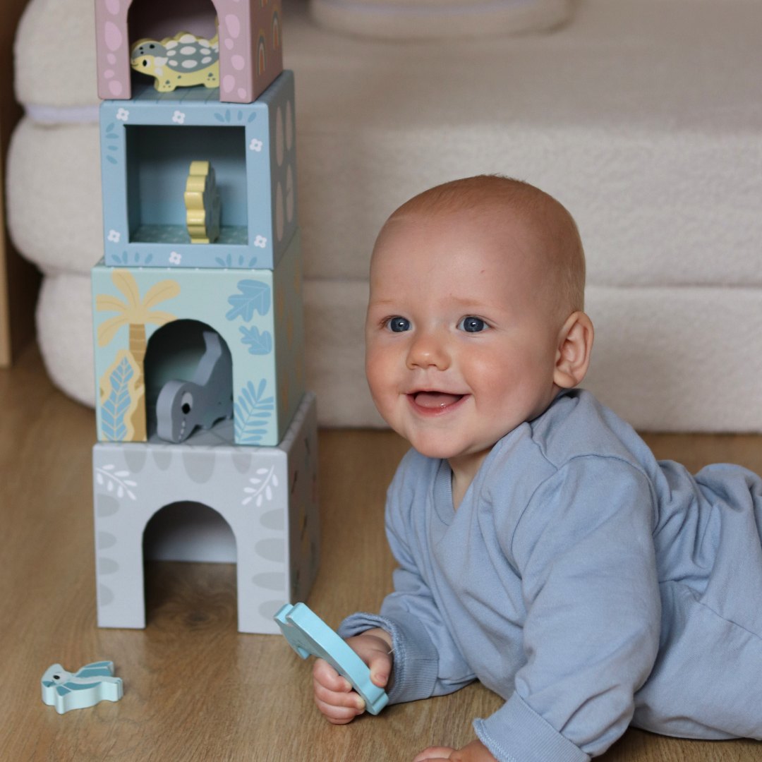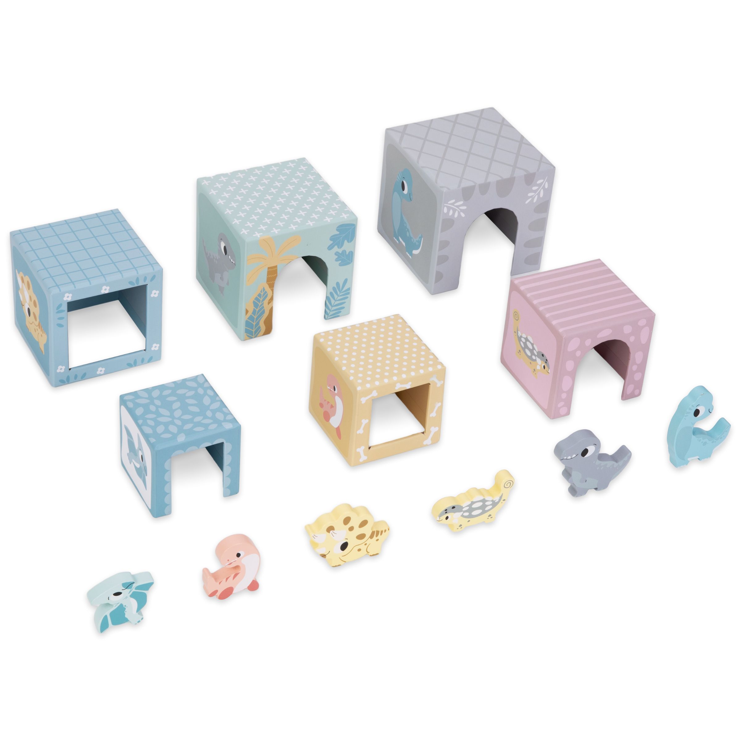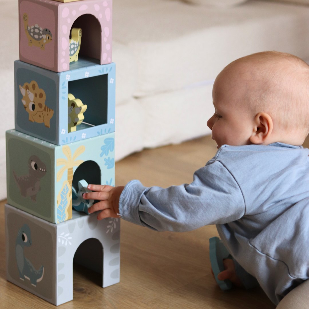 Genom att stapla kartongerna på varandra utvecklar små barn sin öga-handkoordination och övar upp sin fingerfärdighet. Att placera dinosaurierna i rätt lådor förbättrar precision och koncentration. De första framgångarna stärker barnens självförtroende och ger dem mycket roligt. Leksaken tränar också uppfattningsförmåga. Den kan användas för att stödja inlärningen av färger och siffror. Den har en pedagogisk karaktär och dess många användningsområden främjar utvecklingen av barns kreativitet.
